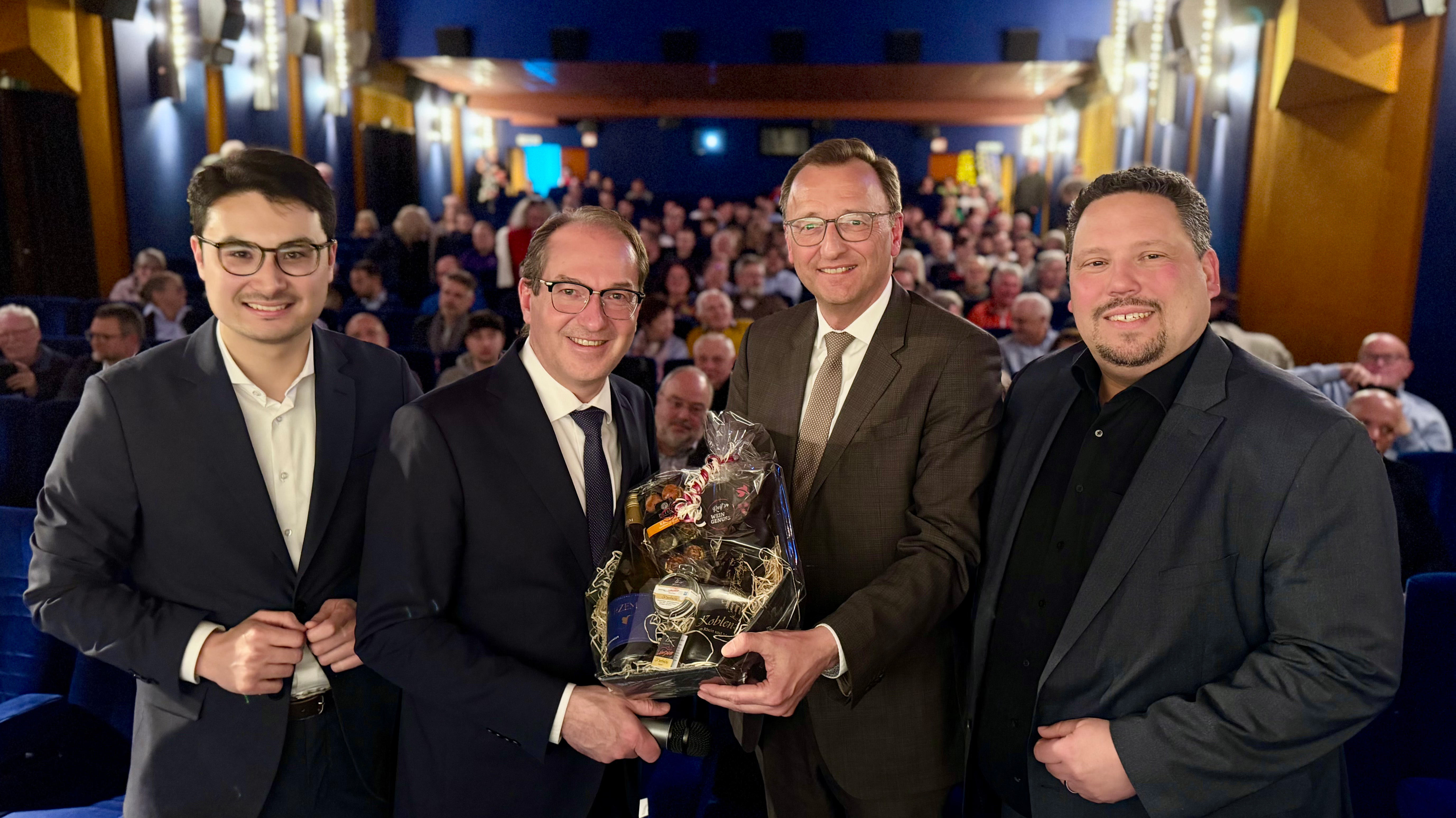 Ein Leistungsträger im Bundeskabinett, ein Zugpferd, ein Macher – die Koblenzer Christdemokraten ließen keinen Zweifel daran, wie groß ihre Wertschätzung für Bundesinnenminister Alexander Dobrindt ist. Dieser war auf Einladung des Landtagskandidaten Philip Rünz zur Veranstaltung „Klartext im Kino“ ins Odeon gekommen, und zwar „sehr, sehr gern“, wie er betonte. Denn natürlich unterstütze er den Landtagswahlkampf eines so engagierten jungen Mitstreiters, wenn es ihm möglich ist, und schloss dabei selbstredend auch den Kandidaten der rechten Rheinseite, Andreas Birtel, und den rheinland-pfälzischen Spitzenkandidaten Gordon Schnieder mit ein.