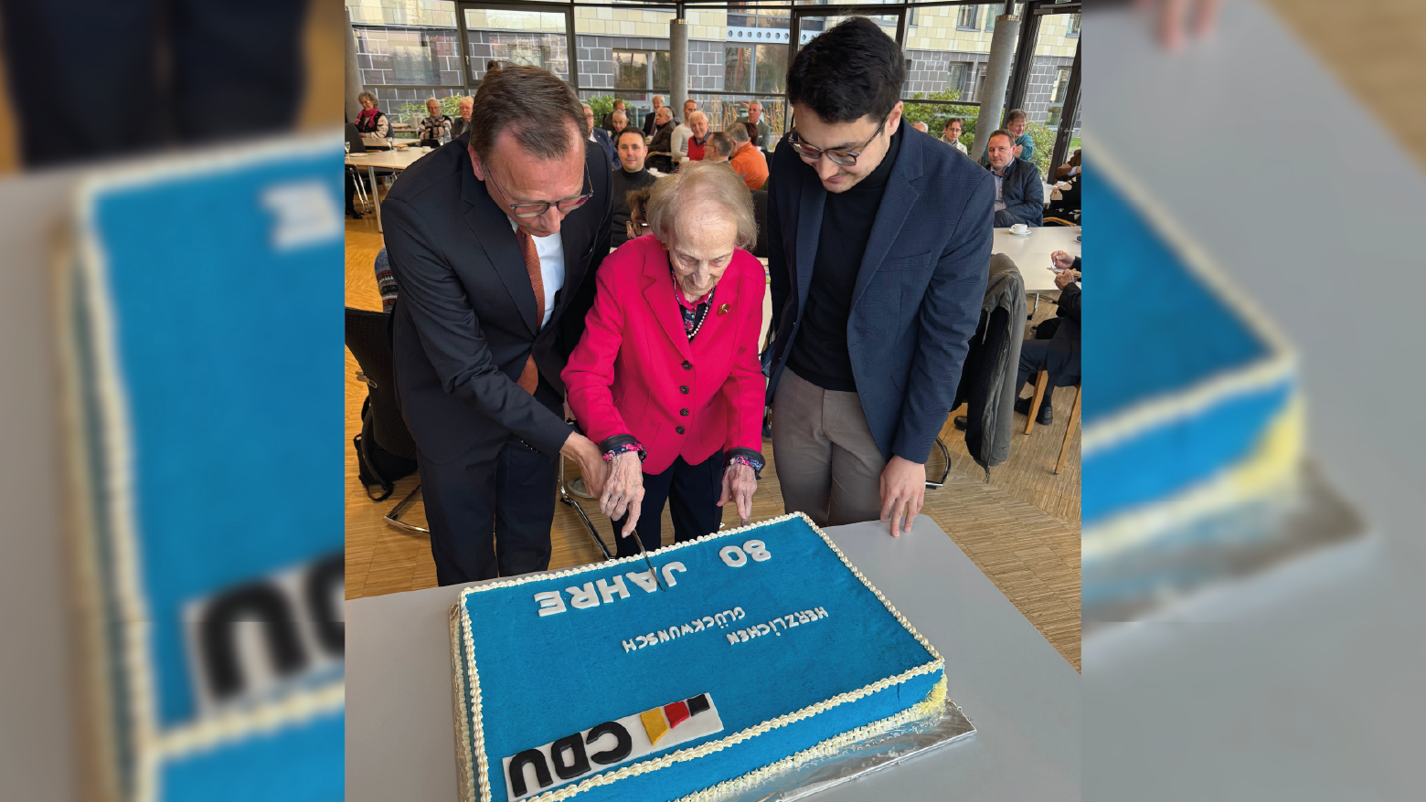 Bei türkisblauer Torte, Sekt und vielen persönlichen Gesprächen stand vor allem der Austausch im Zentrum. Ein Glanzlicht der Feier war die Rede der ehemaligen Staatssekretärin und Bundestagsabgeordneten Roswitha Verhülsdonk, die mit ihren 98 Jahren als Grande Dame der CDU ein beeindruckendes Beispiel für lebenslanges politisches Engagement ist. Mit Anekdoten aus ihrer jahrzehntelangen Arbeit auf kommunaler, Landes- und Bundesebene begeisterte sie die Gäste. „Sie ist und bleibt ein großes Vorbild für uns alle“, betonte Kreisvorsitzender Josef Oster.